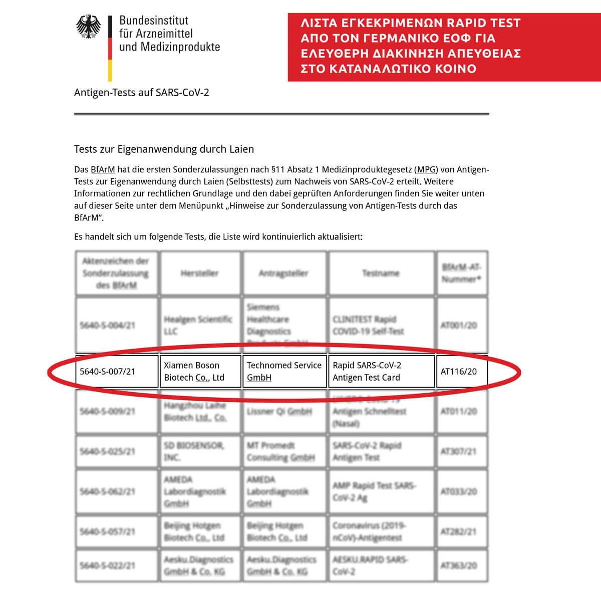 Διαγνωστικό Τεστ ανίχνευσης  Αντιγόνου  κατάλληλο για την ανίχνευση αντιγόνων του κορωνοϊού Covid-19, ένα από τα λίγα προϊόντα με την έγκριση του Γερμανικού ΕΟΦ Bundesinstitut für Arzneimittel und Medizinprodukte (BfArM), αλλά και άλλων ευρωπαϊκών χωρών ανάμεσα στις οποίες η Ελβετία(BAG) και το Ηνωμένο Βασίλειο (MHRA)