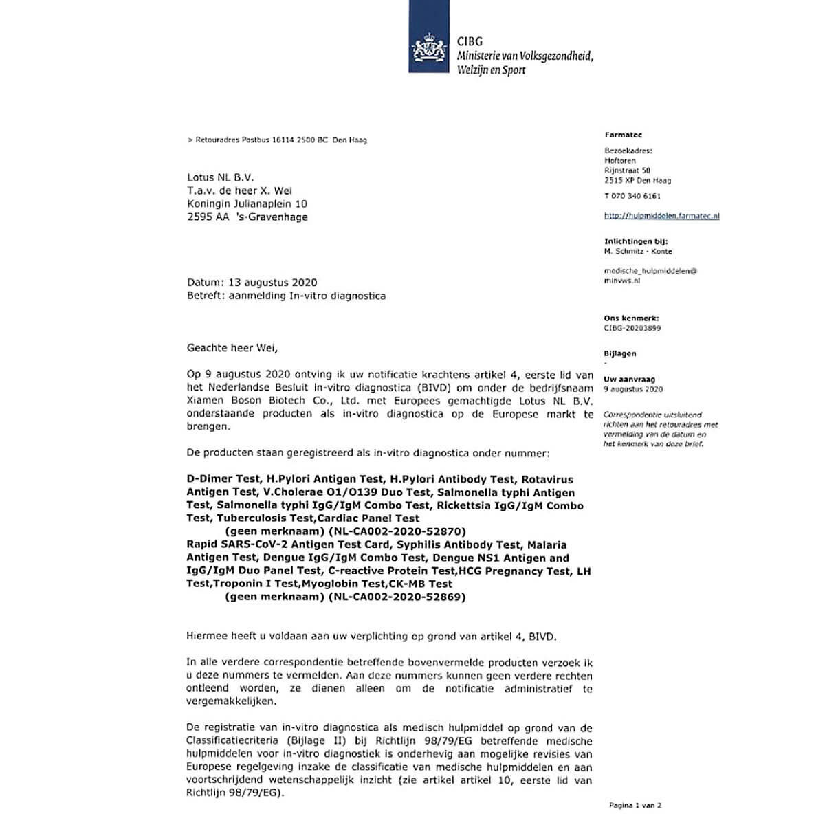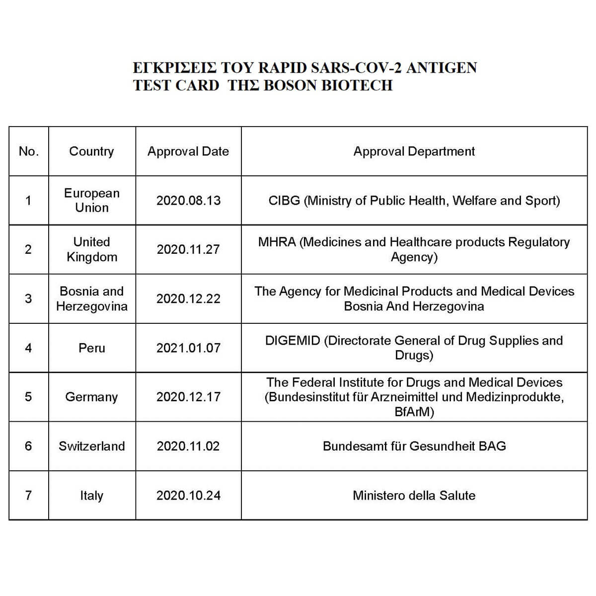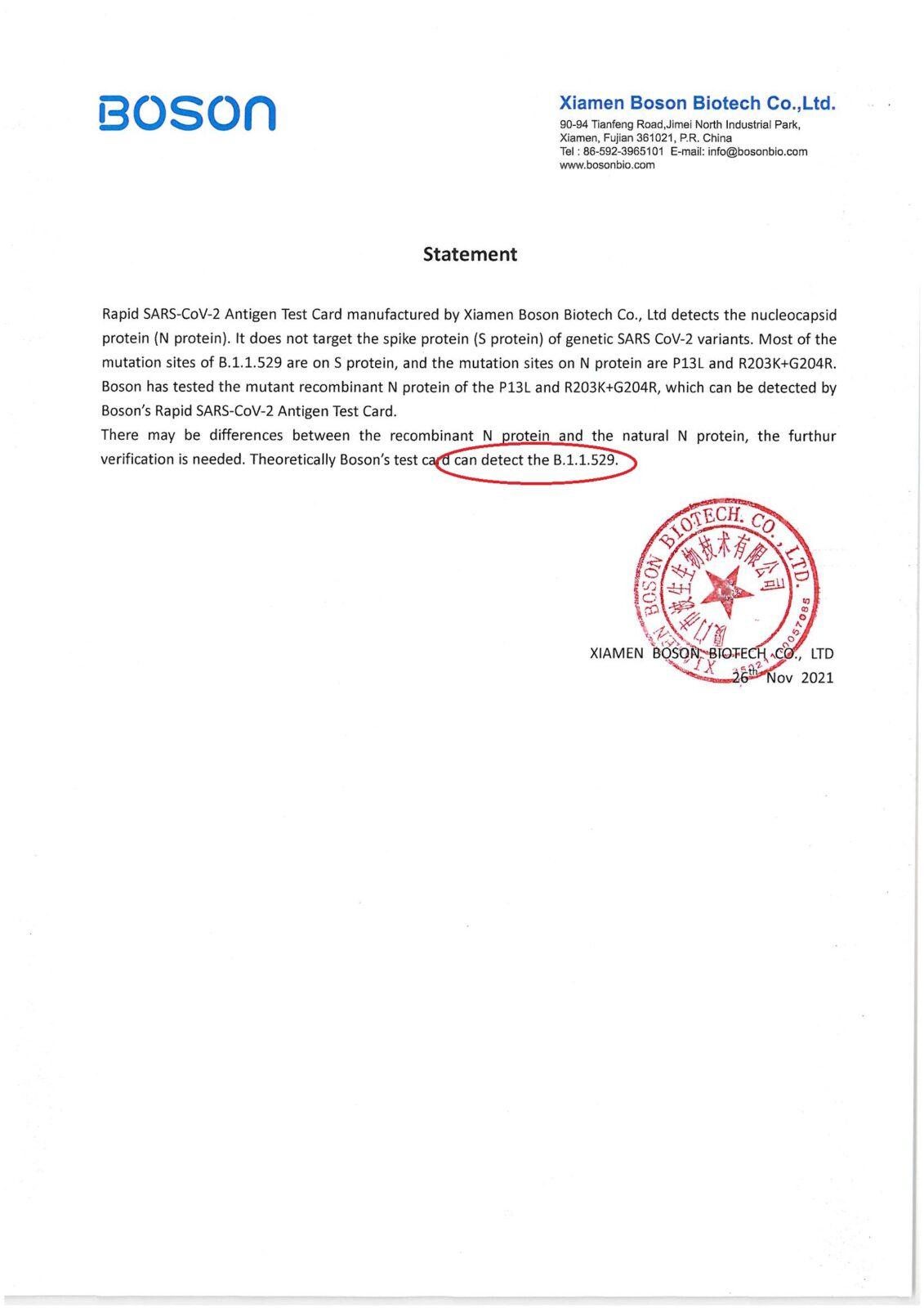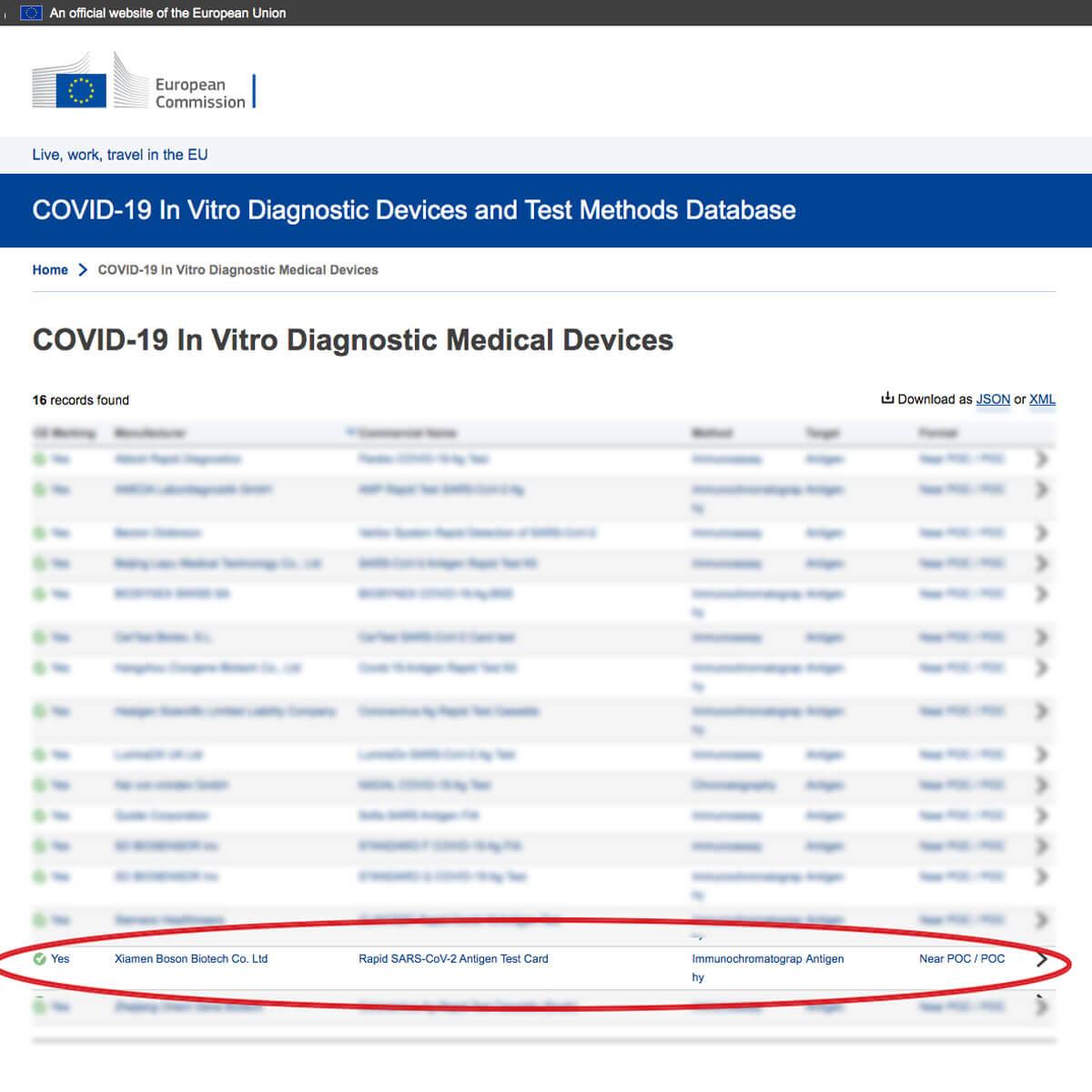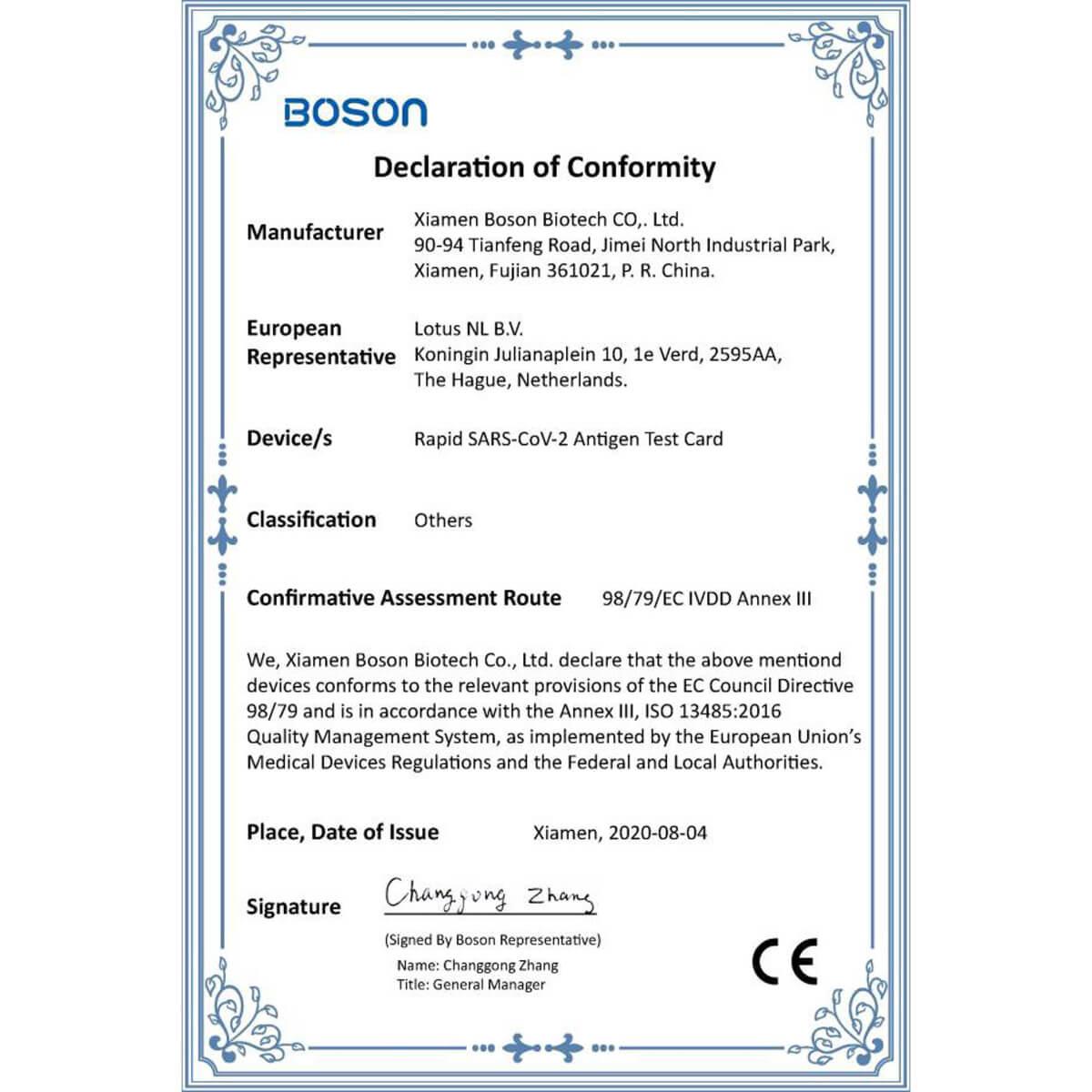 Το τεστ της εταιρείας BOSON είναι ένα από τα ελάχιστα παγκοσμίως που έχει πάρει άδεια κυκλοφορίας και διάθεσης στο ευρύ κοινό από τον Γερμανικό (BfArM) και Ευρωπαϊκό (CIBG) οργανισμό φαρμάκων και μπορεί να διακινηθεί στα ευρωπαϊκά φαρμακεία και σούπερ μάρκετ